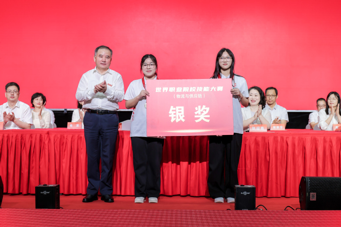 At the 2025 World Vocational College Skills Competition finals, our Business School team clinched the national silver medal, marking a groundbreaking milestone for our university in this prestigious event. At the ceremony, Party Secretary Ding Rongyu presented medals to student representatives who excelled at the World Vocational Skills Competition.