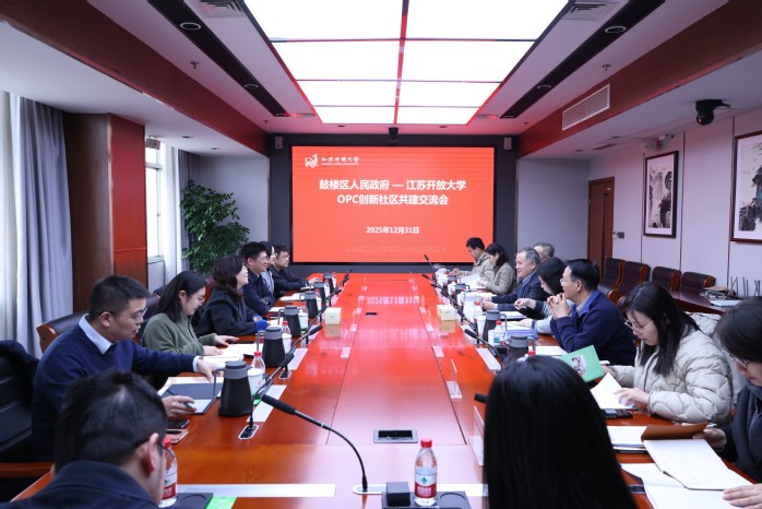 On December 31, Yu Jian, Member of the Standing Committee and Executive Deputy Head of Gulou District, led a delegation to Jiangsu Open University for a meeting on jointly building a “6S” OPC Innovation Community to support high-quality digital economic development. The delegation included officials from various local government departments.
